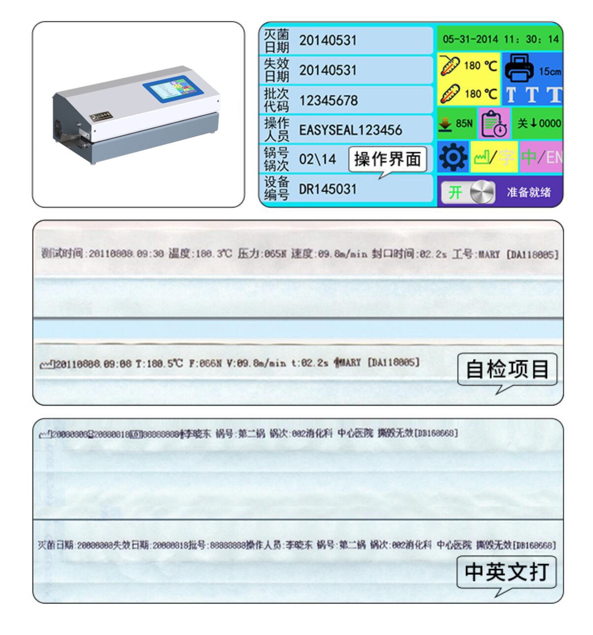 (4)自帶封口機(jī)中英文打印系統(tǒng),打印清晰,設(shè)置打印事項(xiàng)簡(jiǎn)便快捷,打印字體寬窄可調(diào),方便將更多的內(nèi)容打印到相對(duì)窄的袋子上,打印功能可一鍵關(guān)閉也可按需要關(guān)閉某條目,靈活、方便、快捷;